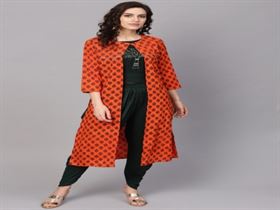 Shop from a huge range of designer womens etheric wear manufacturer Shubham creation Jaipur. This clothing set consists of top and palazzos and ethnic shrug. Green embroidery crop top has a round neck. Green rayon has a partially elasticated waistband, one pocket. comes with orange embroidery print work solid long-line open front ethnic shrug has 3 4 sleeves.